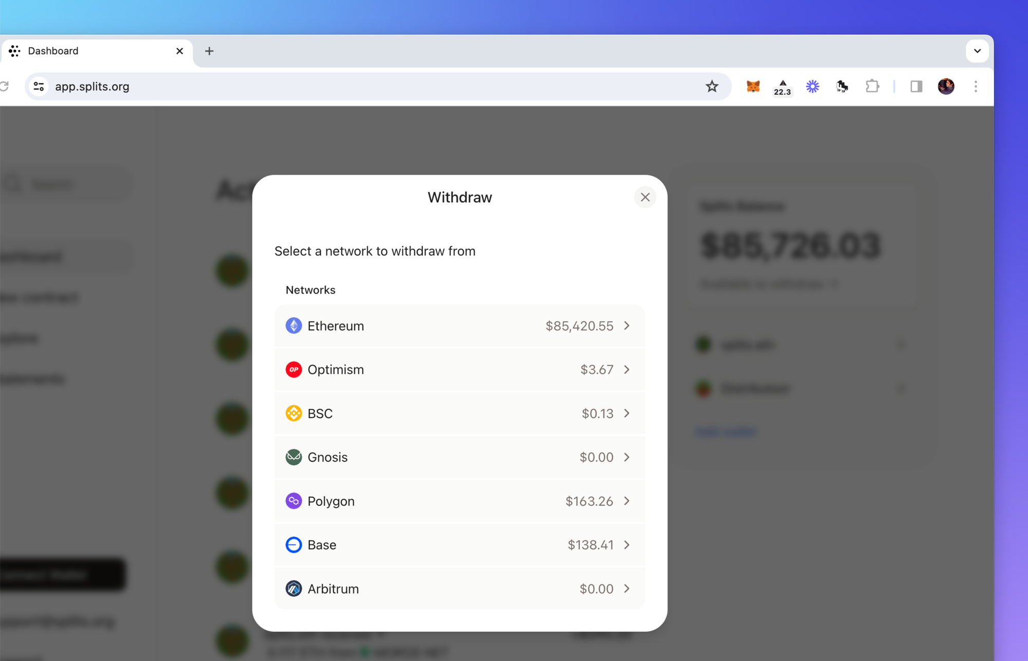Select the network from which you’d like to withdraw, then select the balances on that network. Balances that have yet to be distributed will have the name of the upstream Split noted underneath. If you select one of these balances, distribution and withdrawal will be bundled together into one step for you.